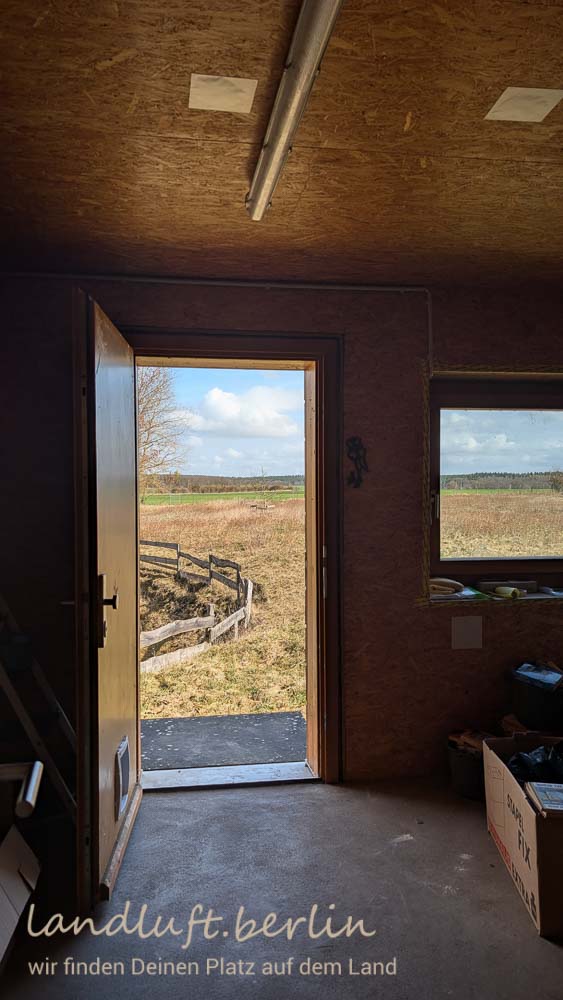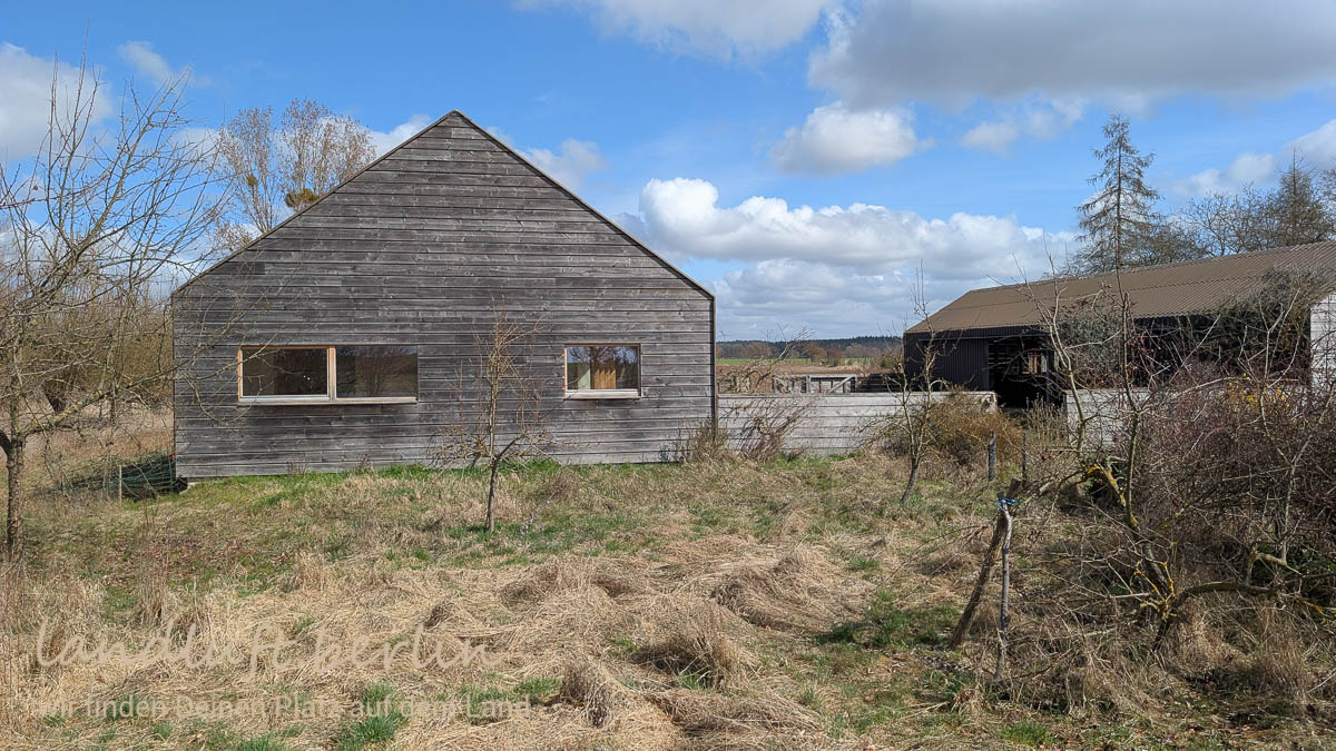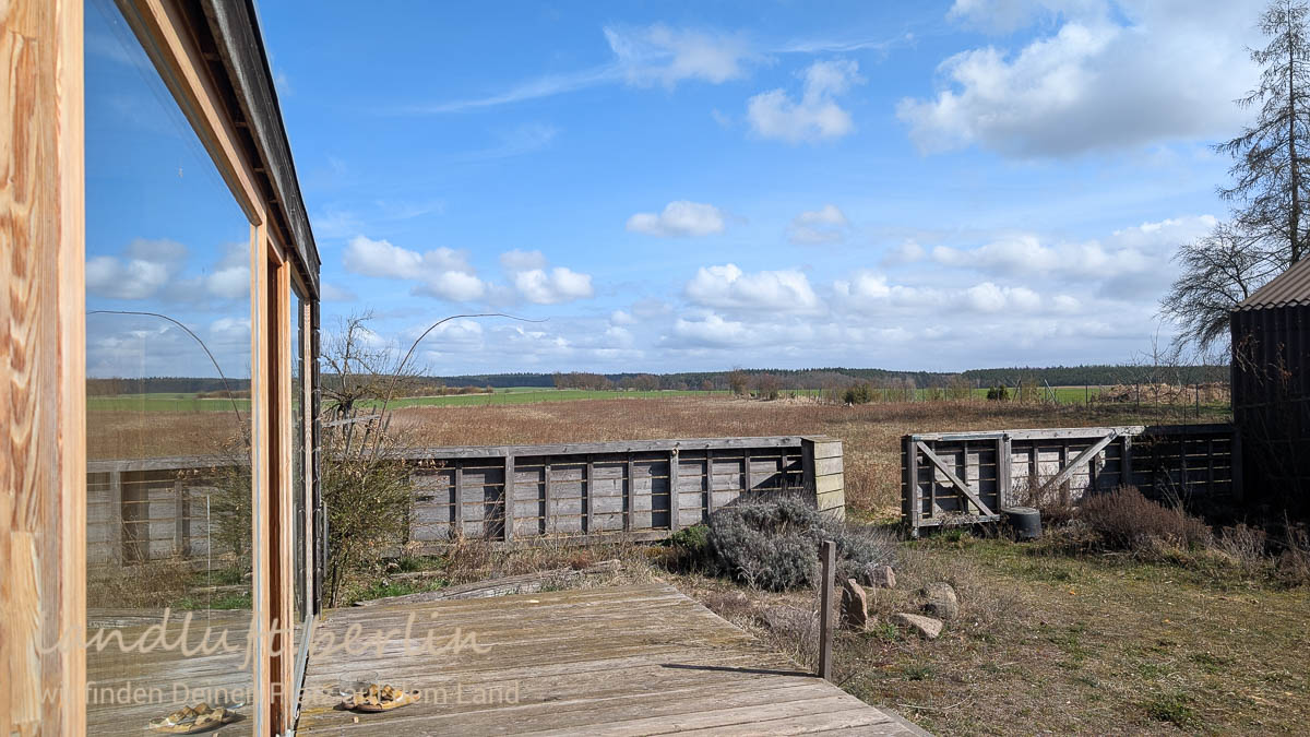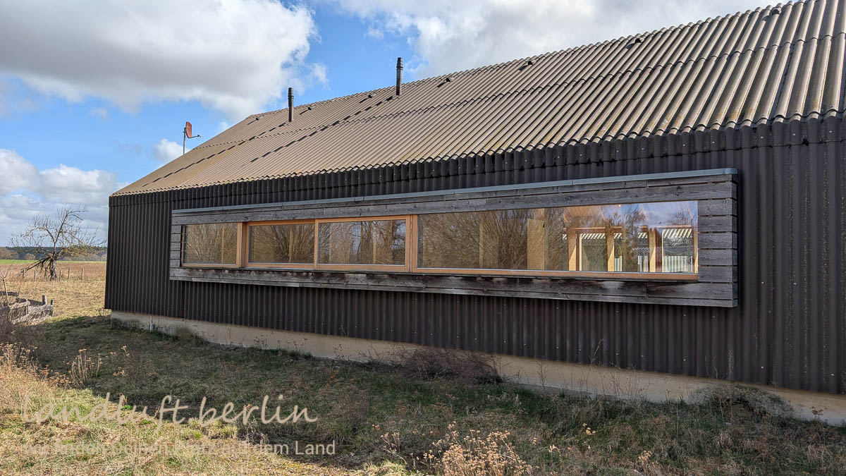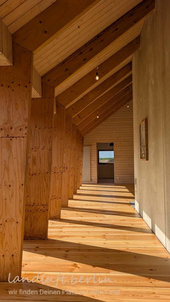 Der Hof ist ein gut gelungenes, sehr bewohnenswertes und aus gutem Grund prämiertes Beispiel zeitgenössischer ländlicher Architektur. Seine geschlossene Form vermittelt Schutz in der weiten Landschaft. Das warme Braun des Holzes im sonnendurchfluteten und sehr großzügigen Inneren kontrastiert mit dem klaren Blau des riesigen uckermärkischen Himmels darüber.