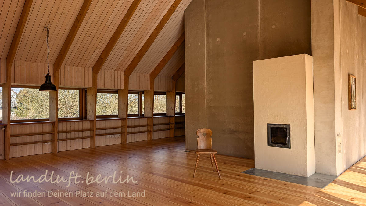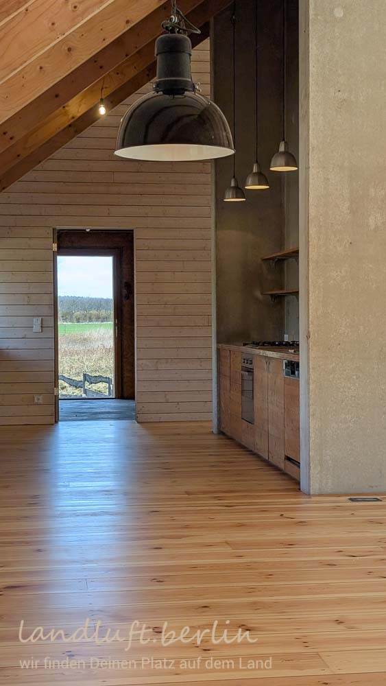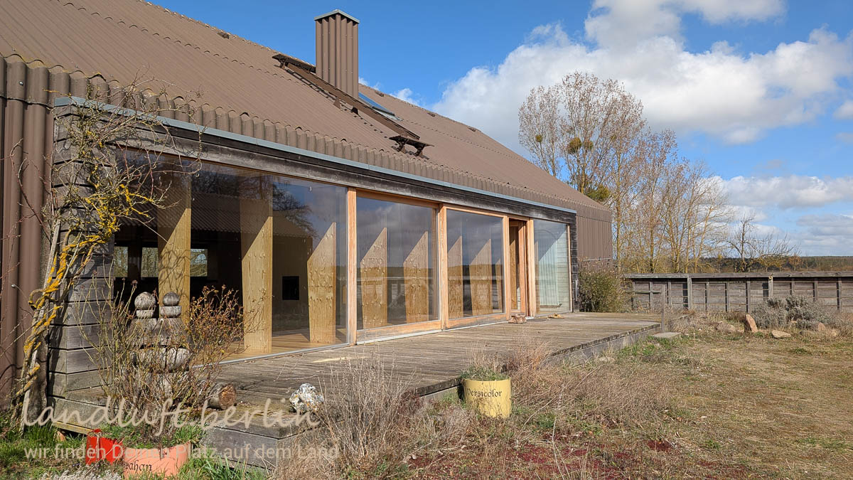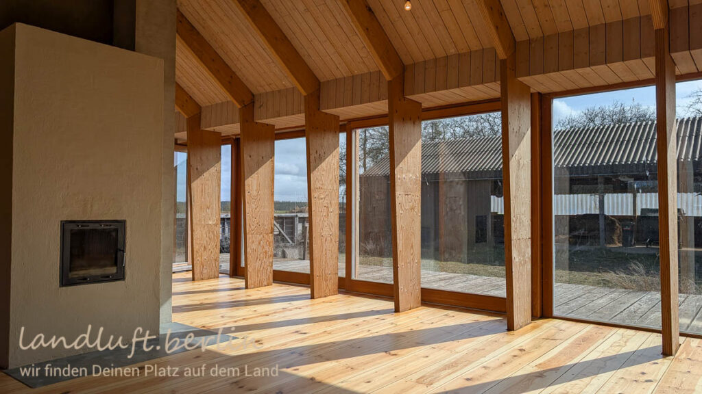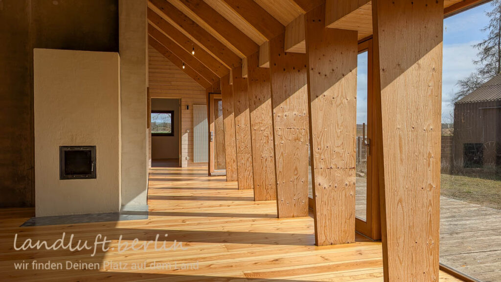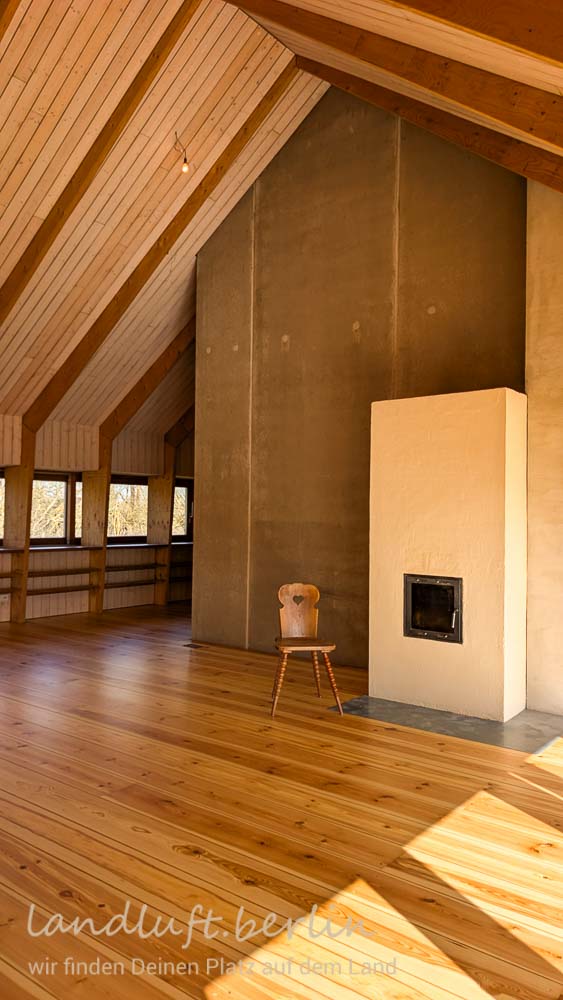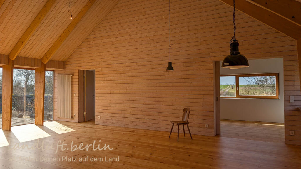 The property is a well-executed, highly livable, and award-winning example of contemporary rural architecture. Its enclosed form provides a sense of shelter within the expansive landscape. The warm brown of the wood in the light-filled, generously proportioned interior contrasts with the clear blue of the vast Uckermark sky above.