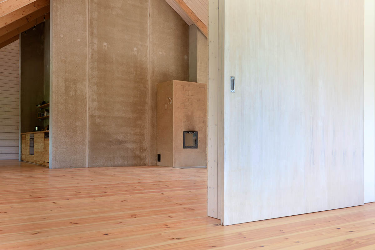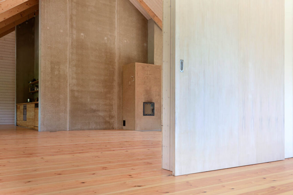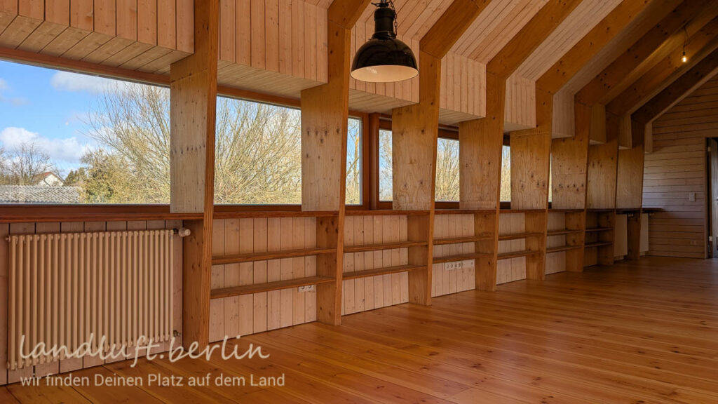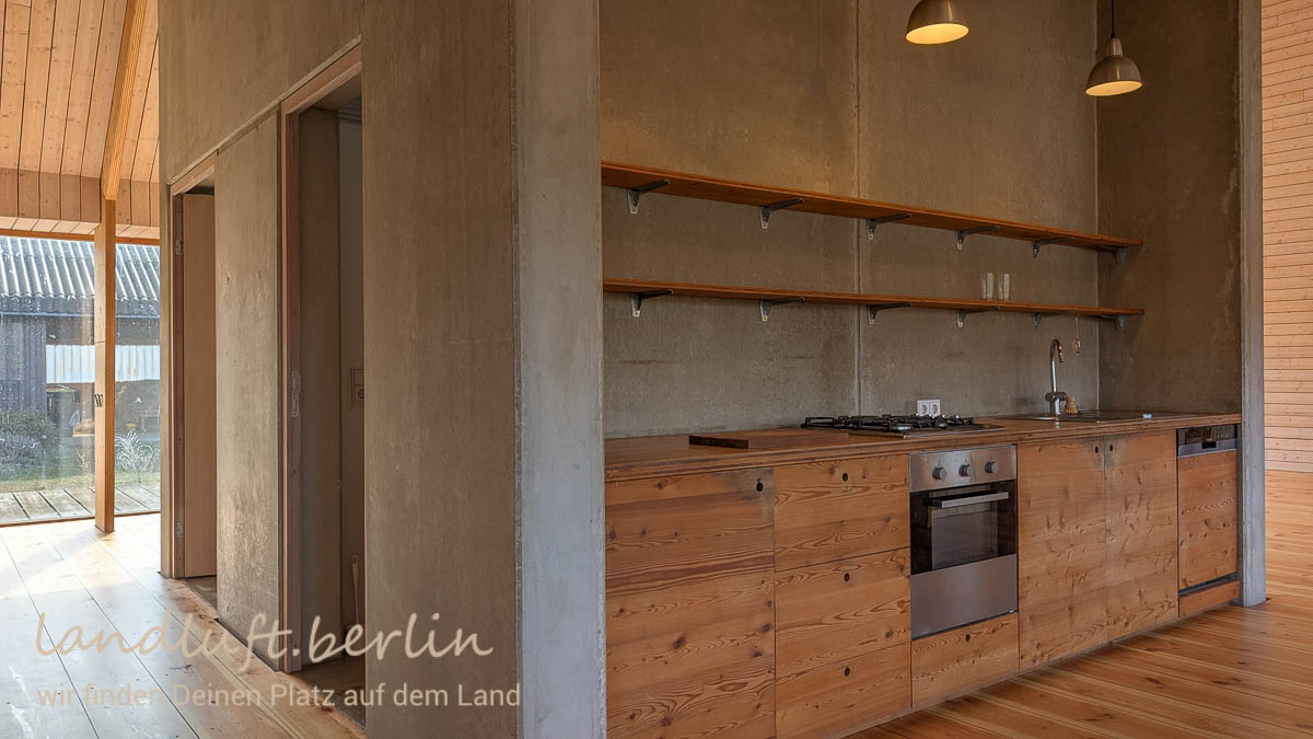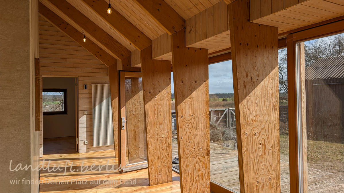 The property is a well-executed, highly livable, and award-winning example of contemporary rural architecture. Its enclosed form provides a sense of shelter within the expansive landscape. The warm brown of the wood in the light-filled, generously proportioned interior contrasts with the clear blue of the vast Uckermark sky above.