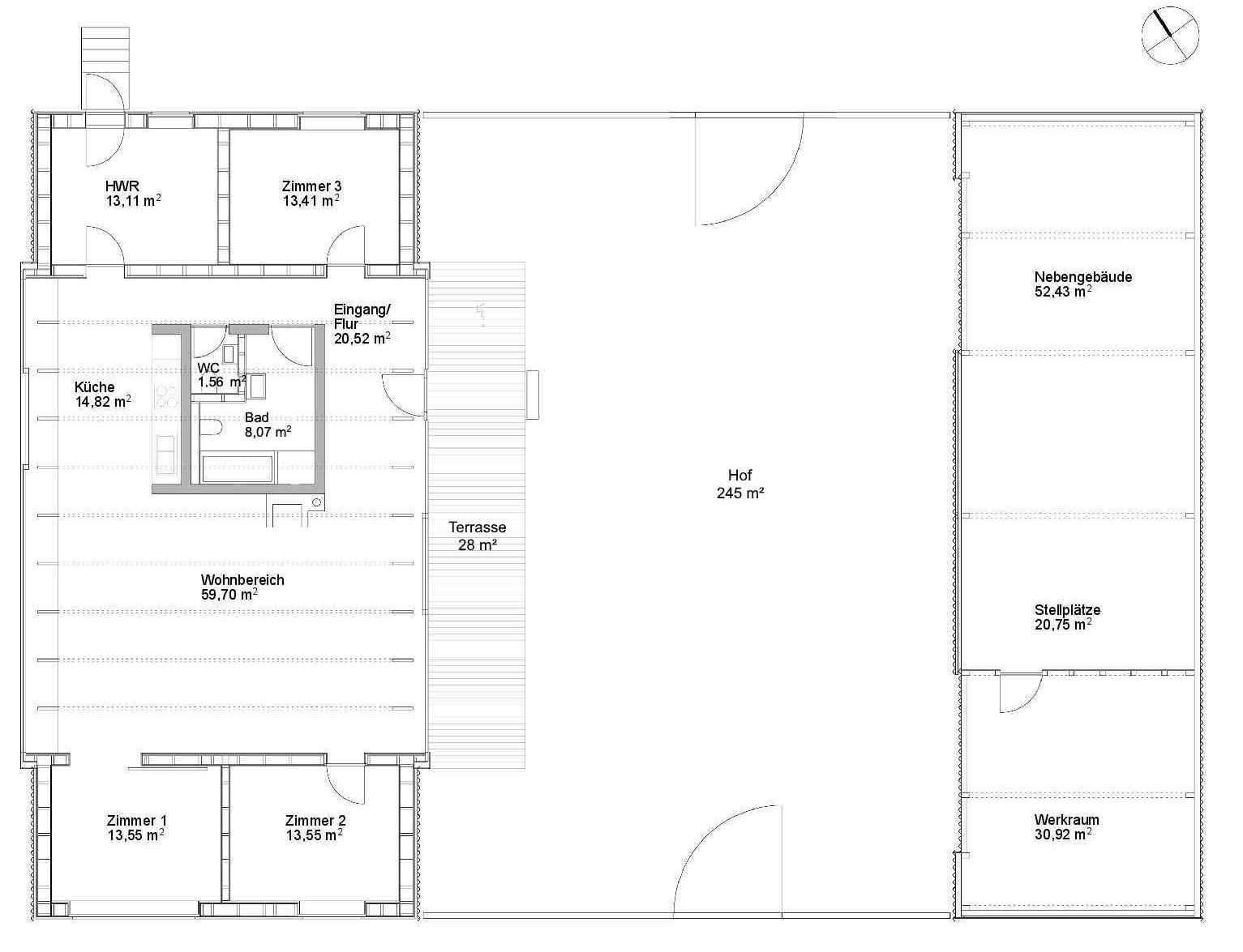 Nebengebäude Eingeschossiger Holzbau auf massiver Bodenplatte mit ca. 105 m² Nutzfläche
