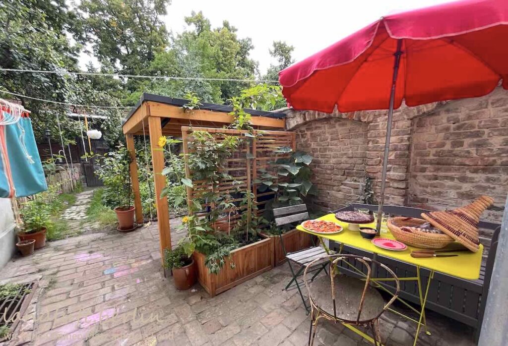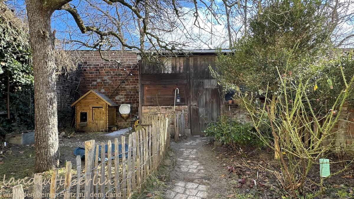 | Bewuchs | Birnbaum, 2 kleine Apfelbäumchen, Aprikosenbäumchen, alter Weinstock, Mandelbäumchen, Johannisbeeren, Himbeeren, Stachelbeeren, Rhododendren, div. Frühblüher |