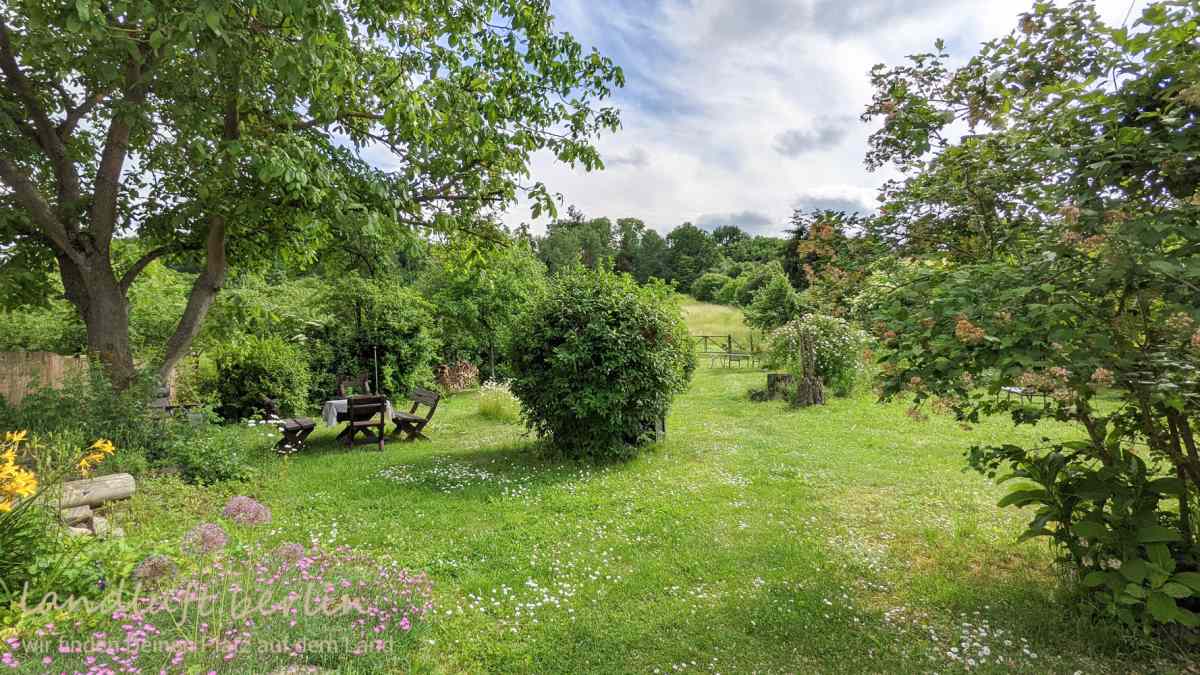 | Grundstück | ca. 7.300 m² umzäunt, davon ca. 1.300 m² als Obst- und Ziergarten angelegt und leicht abfallend, ca. 4.000 m² leicht ansteigende Wiese und gut 1.700 m² steil ansteigender Laubwald.. |