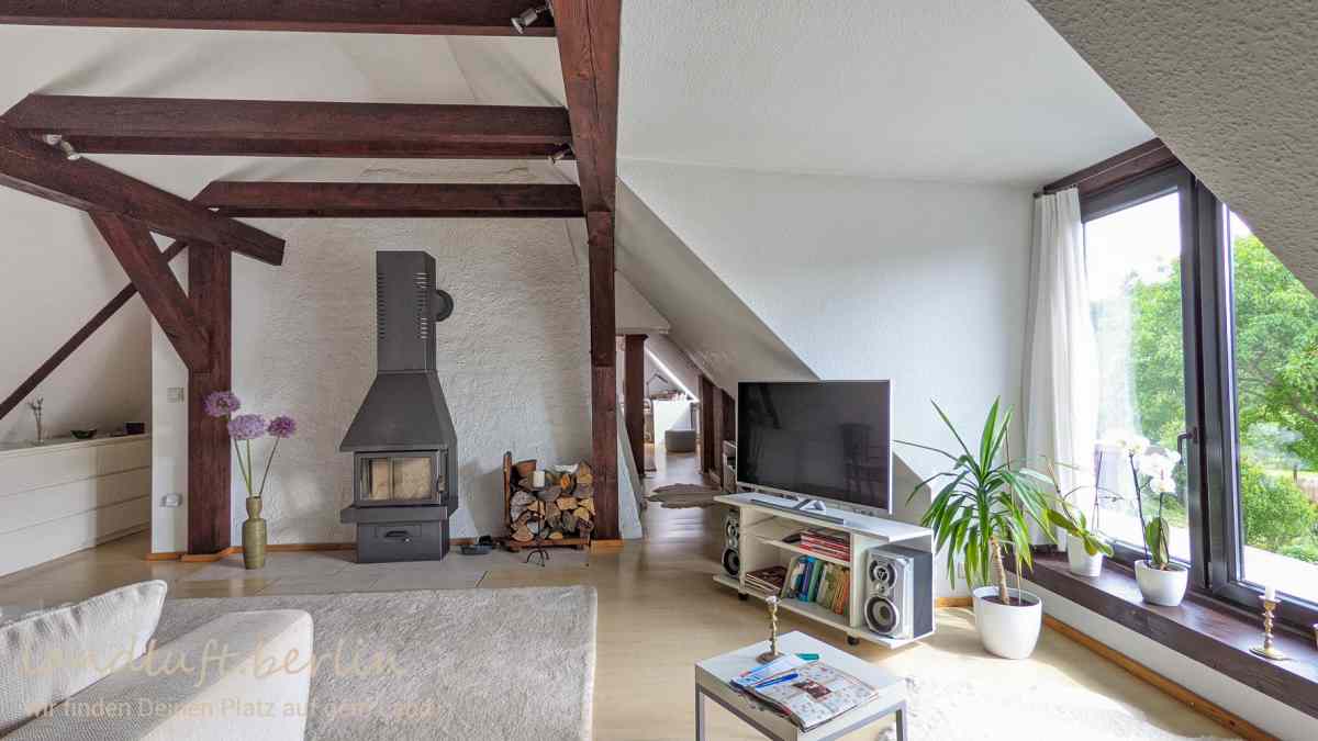 - Wohnzimmer mit Gaube und Kamin oben, Durchgang zum Schlafbereich