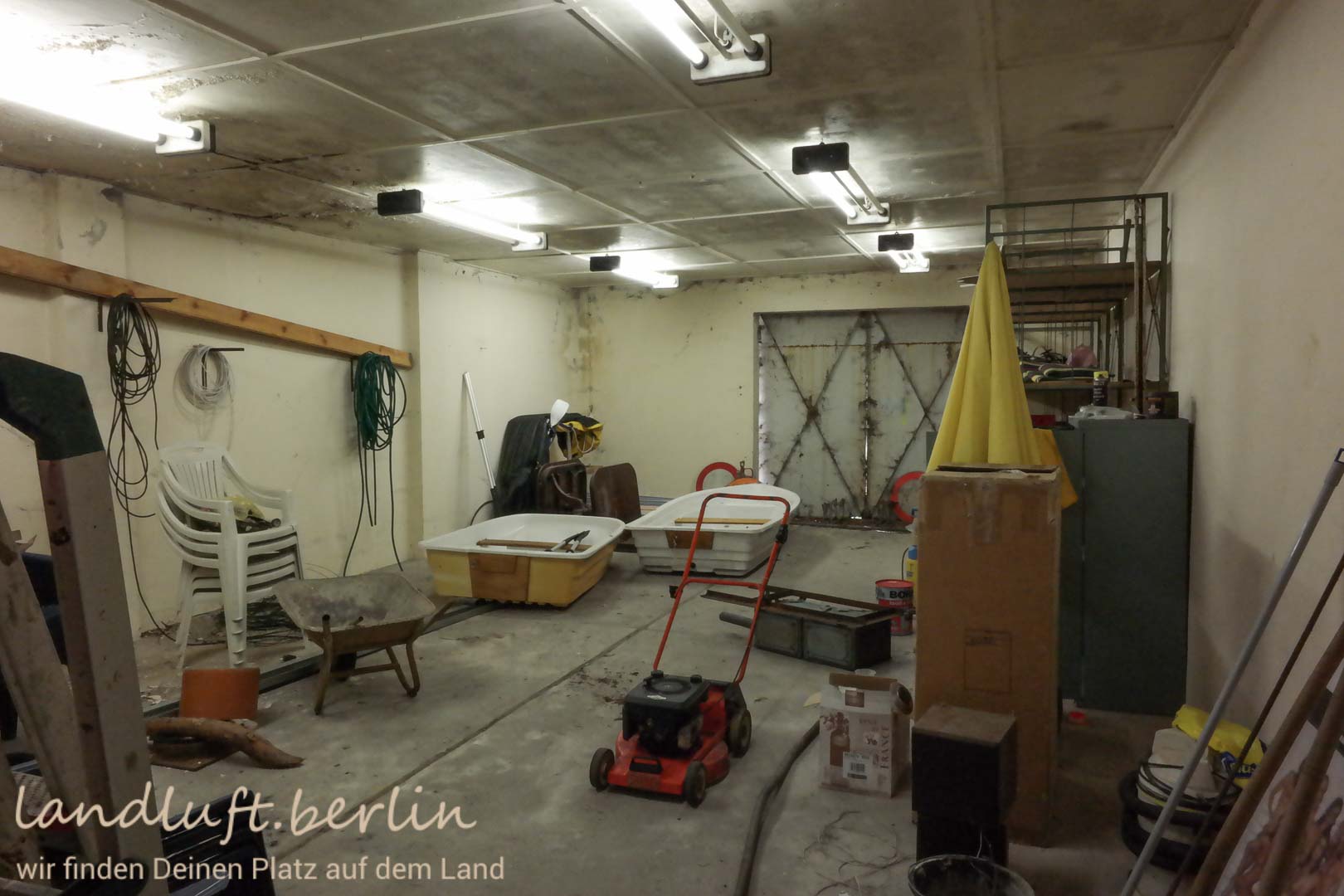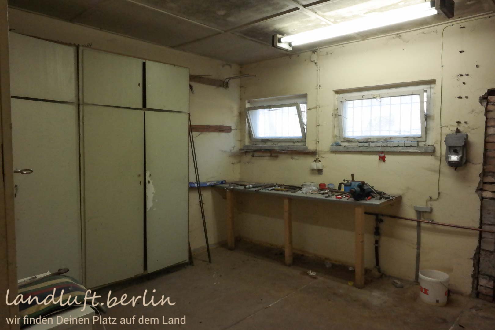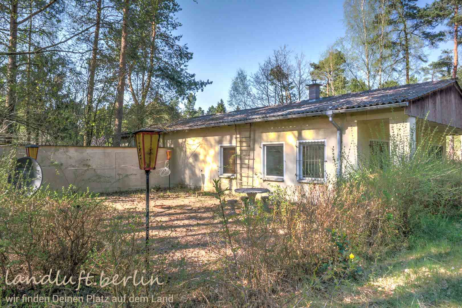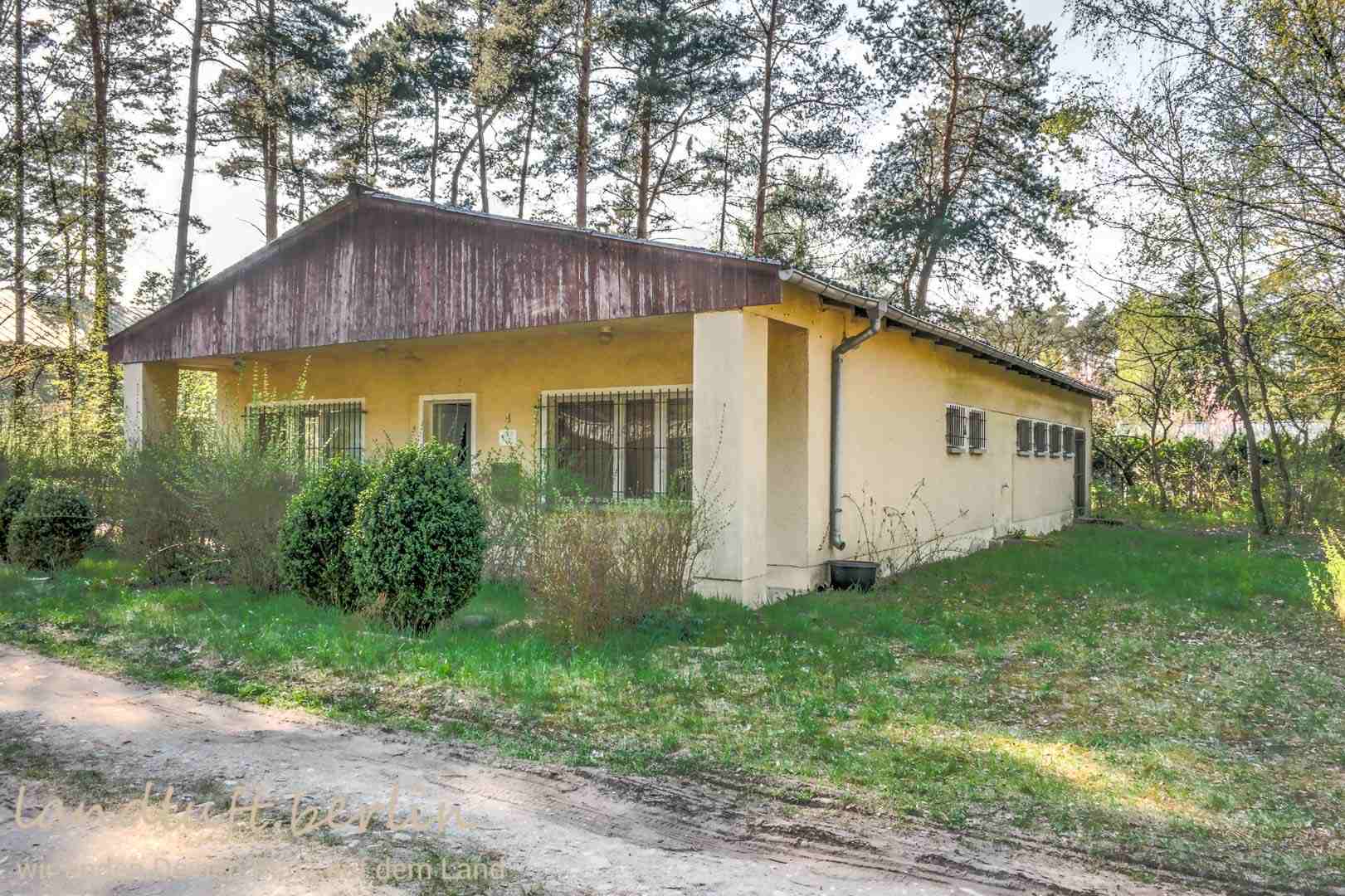 With its numerous lakes and forests, with the historic centres of Neuruppin, Rheinsberg and Gransee, as well as with the annual cultural events in Rheinsberg, the Ruppiner Land region is an old favourite for holidays and day trips. Just one hour to the northwest of Berlin and easily reached by public transport, one will there quickly detach from daily routine. The plot of land on offer special in as far as it lies amidst a natural surround, close to a lake (150 m) and at the same time comes with a planning permission. It ist part of a nearly 4,5 ha large area which has been divided into 36 plots. The plot owners share ownership of the almost 200 m long lake shore as well as of the infrastructure (driveways, fresh water supply, wastewater disposal). The plot is. It has a size of 1051 m². There is an old one story building with solid brick walls, build in GDR-days, which then housed a caretaker and his workshop. It has a floorspace of about 170 m². After reunification the living quarters were partly renovated. There is a kitchen as well as a bathroom.