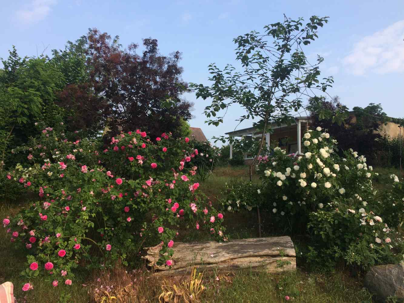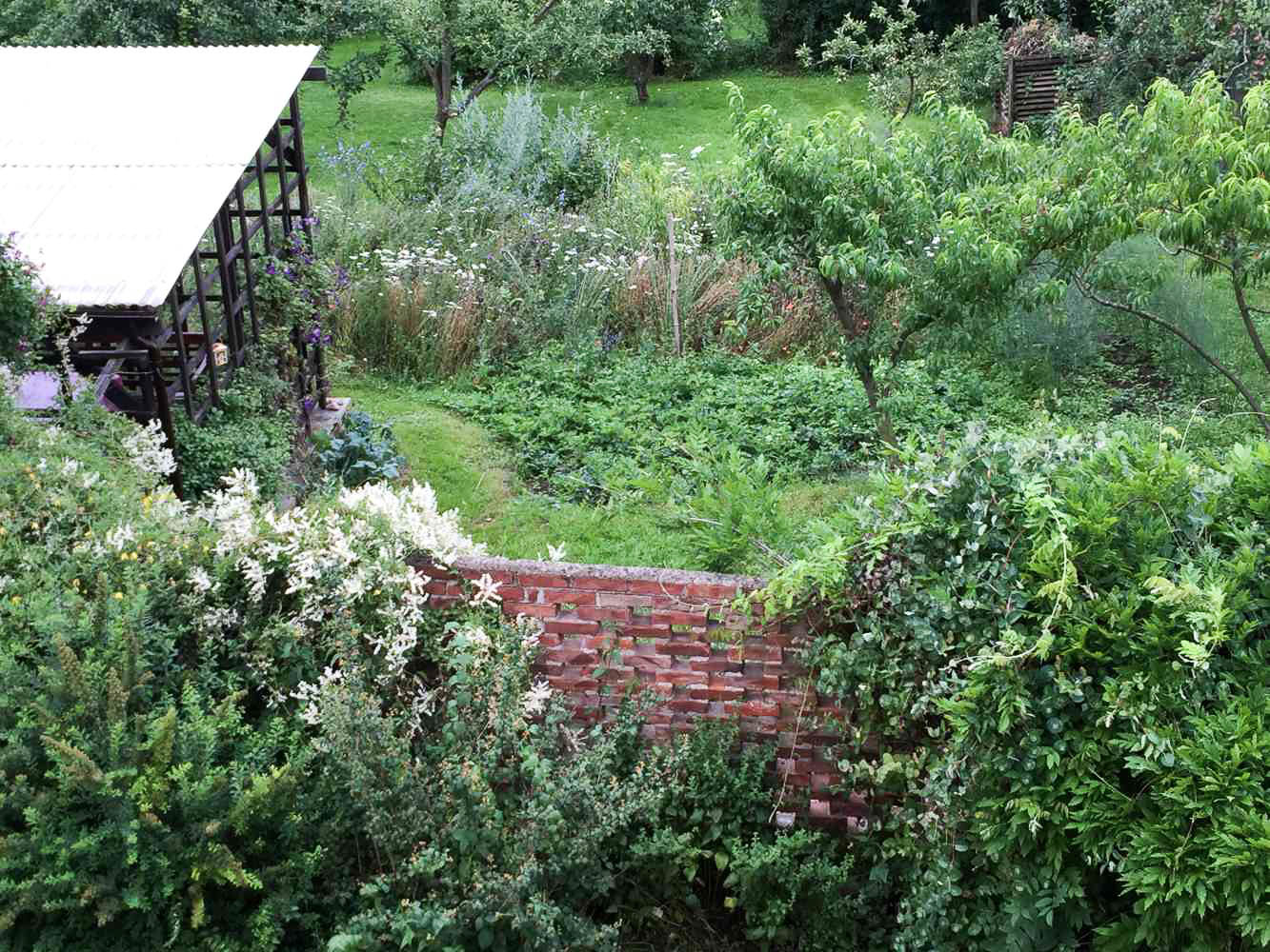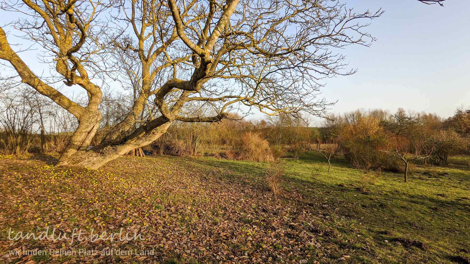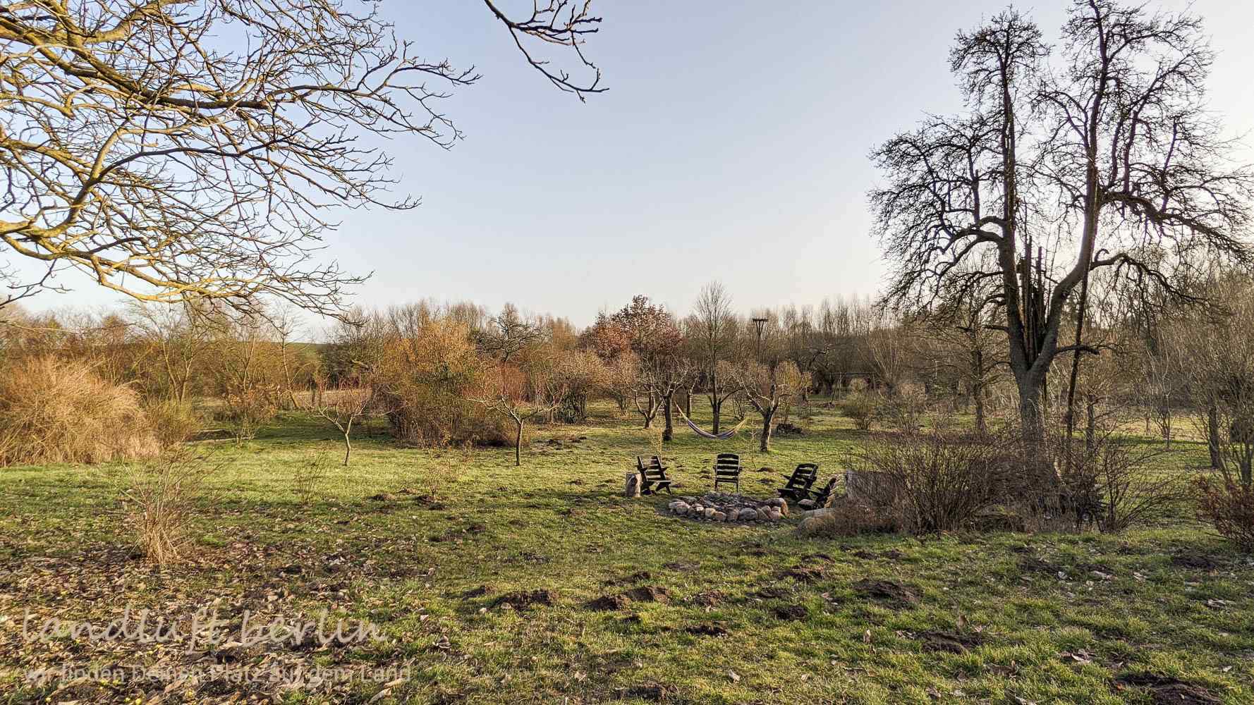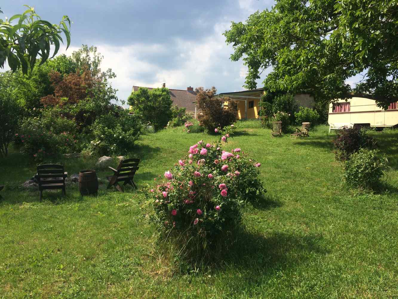 Grundstück ca. 5.550 m², leicht geschwungen und abfallend mit Wiese, Sträucher, Stauden, Blumen, Obst- und Laubbäume & ca. 100 m² Anbaufläche