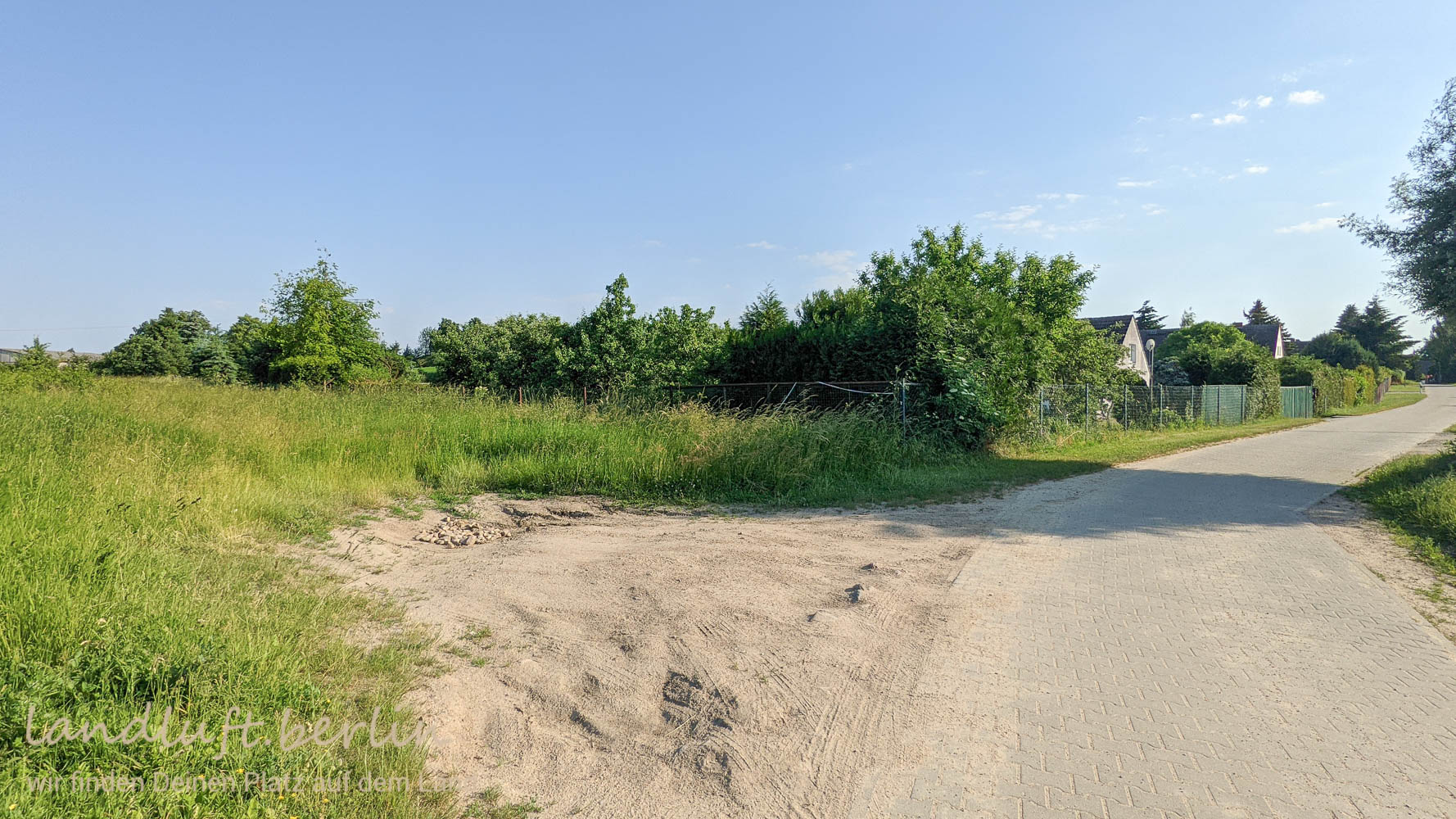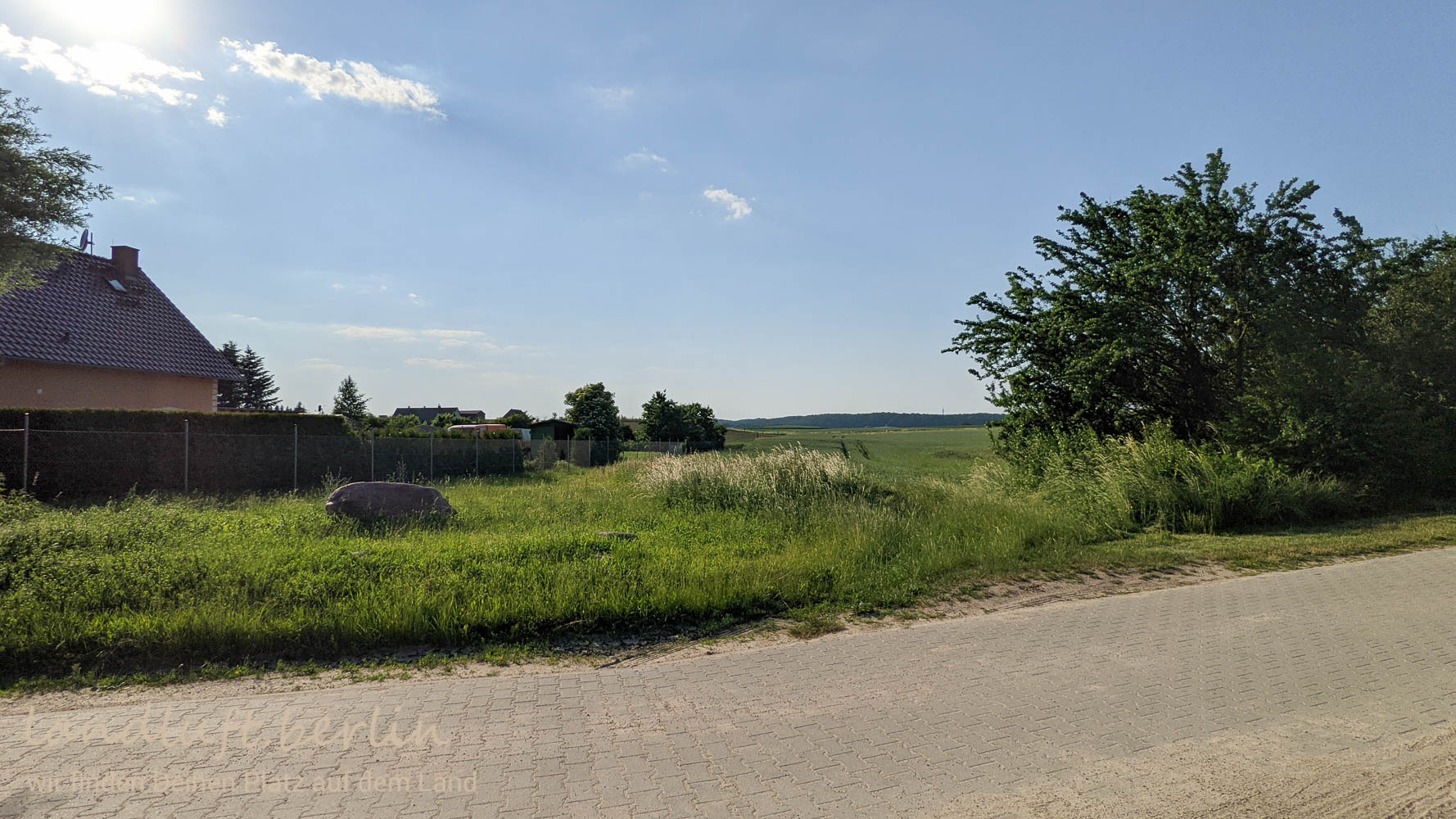 Ein straßenseitig (ca. 22 m Straßenfront) bebaubares, teilerschlossenes (Trinkwasser, Strom, Internet) großes Grundstück (3.647 m²), gelegen am Rand eines kleinen Ortes, an einer Anliegerstraße, auf deren gegenüberliegenden Seite nicht gebaut werden darf, die 50 m weiter zum Feldweg wird, im Biosphärenreservat Schorfheide Chorin mit schönster Naturlandschaft in nächster Umgebung (UNESCO-Weltnaturerbe Buchenwald, Parsteiner See), gut angebunden (Berlin <1h) über Straße und Bahn. Gegen die ca. 300 m weiter südöstlich verlaufende und je nach Windrichtung hörbare Bundesstraße möchte man sich eventuell noch etwas abschirmen.