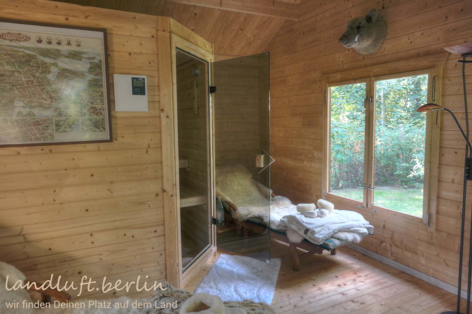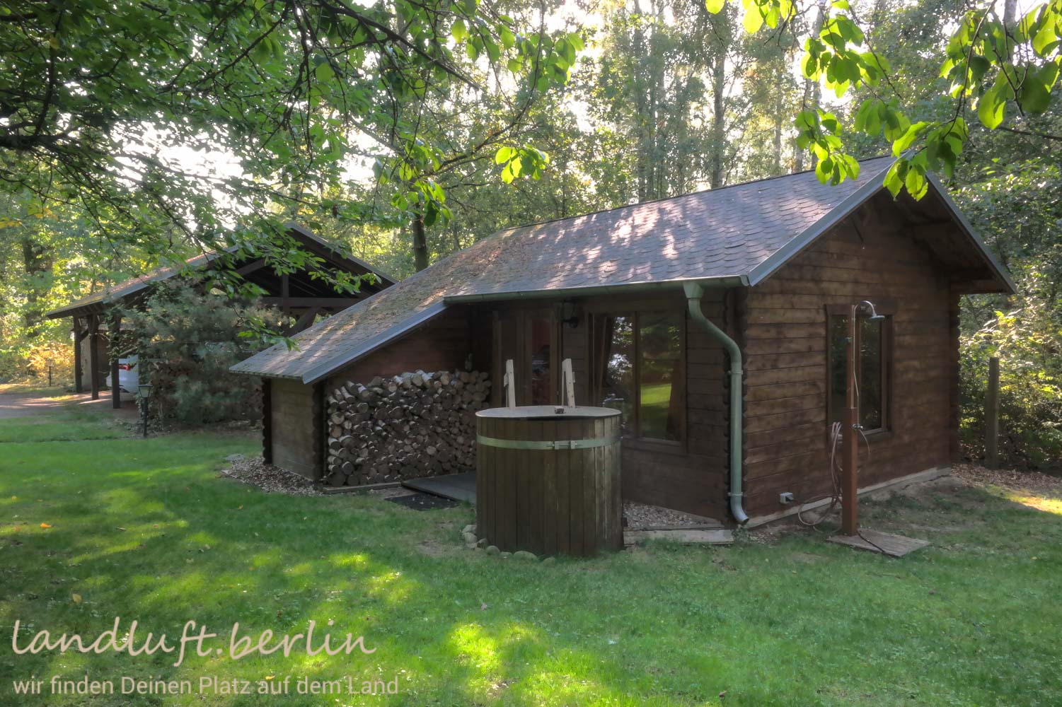 - Sauna mit Tauchfass und Außendusche, im Hintergrund der Carport