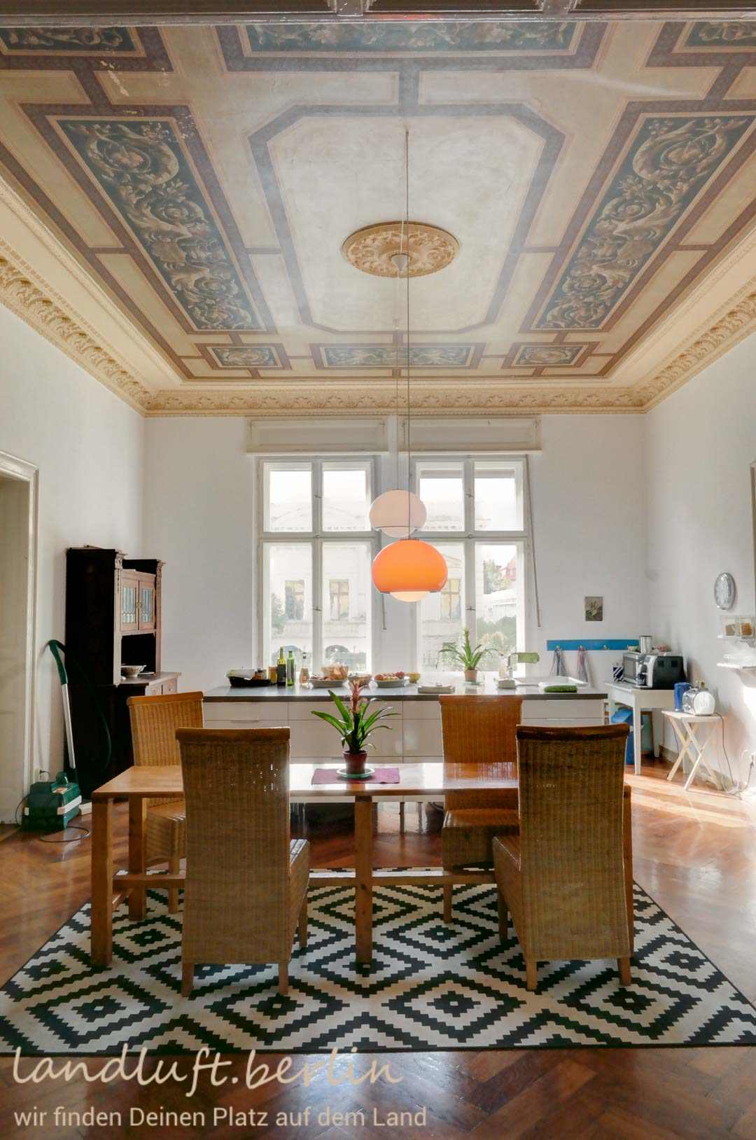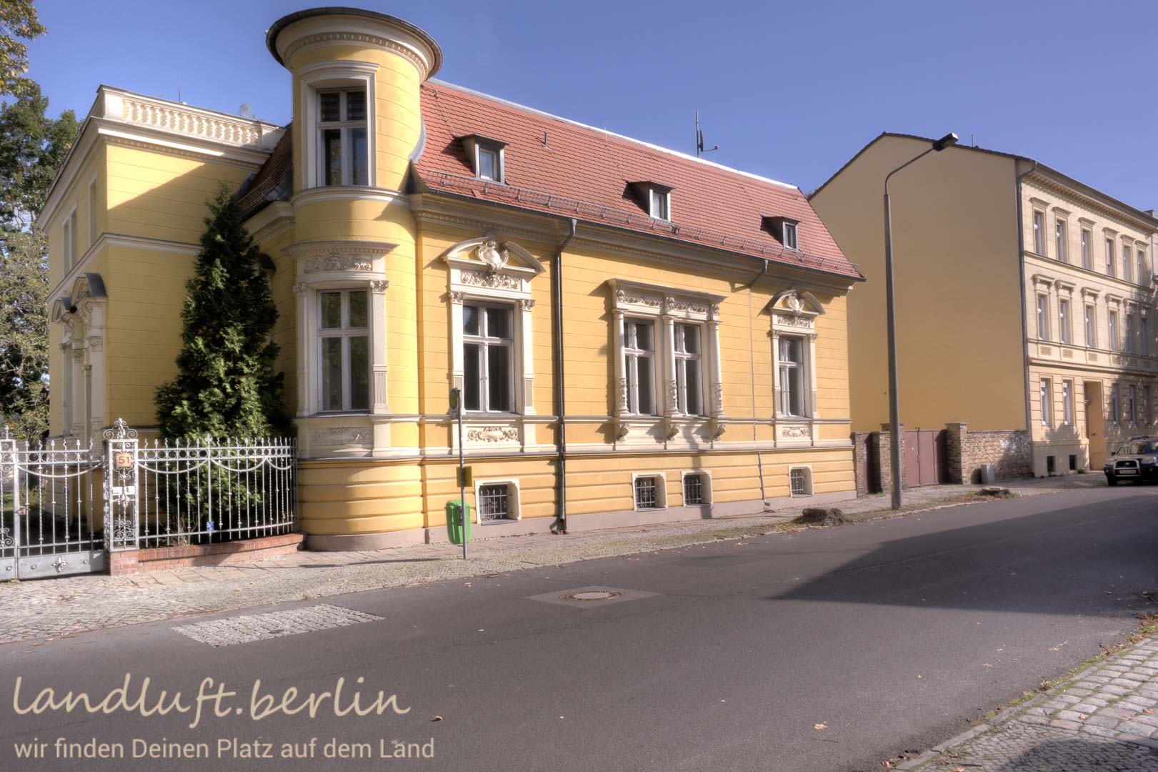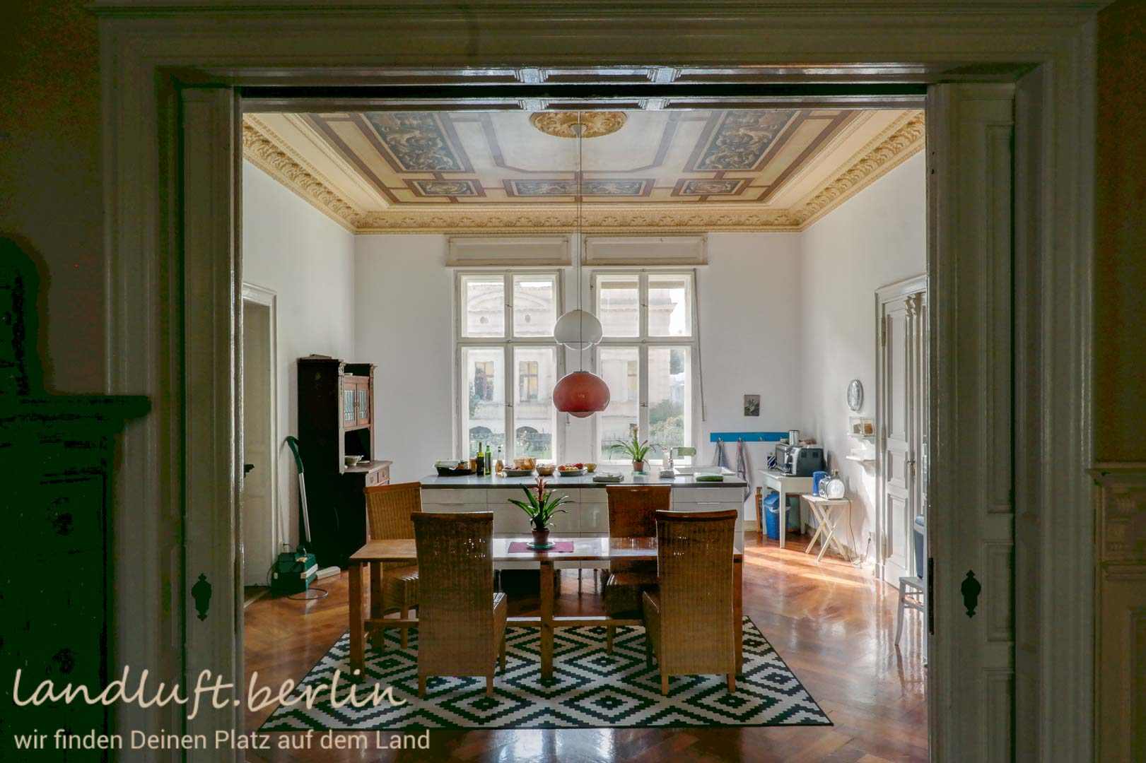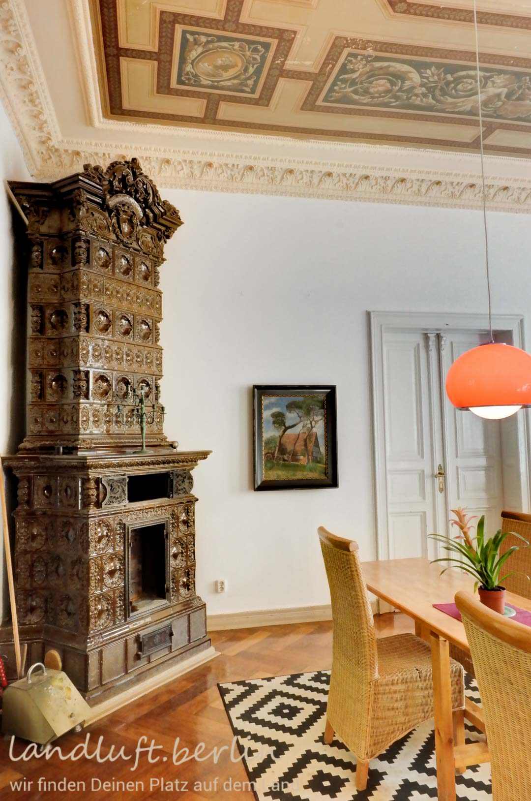 A late 19th century mansion, with very spacious rooms and elaborate original details, made with a craftsmanship almost unaffordable today. Situated in the center of a recently brushed up quaint small town which is probably on the verge of becoming popular, amidst a beautiful landscape with a high recreational value and at the same time only 40 minutes by train from central Berlin (Potsdamer Platz).