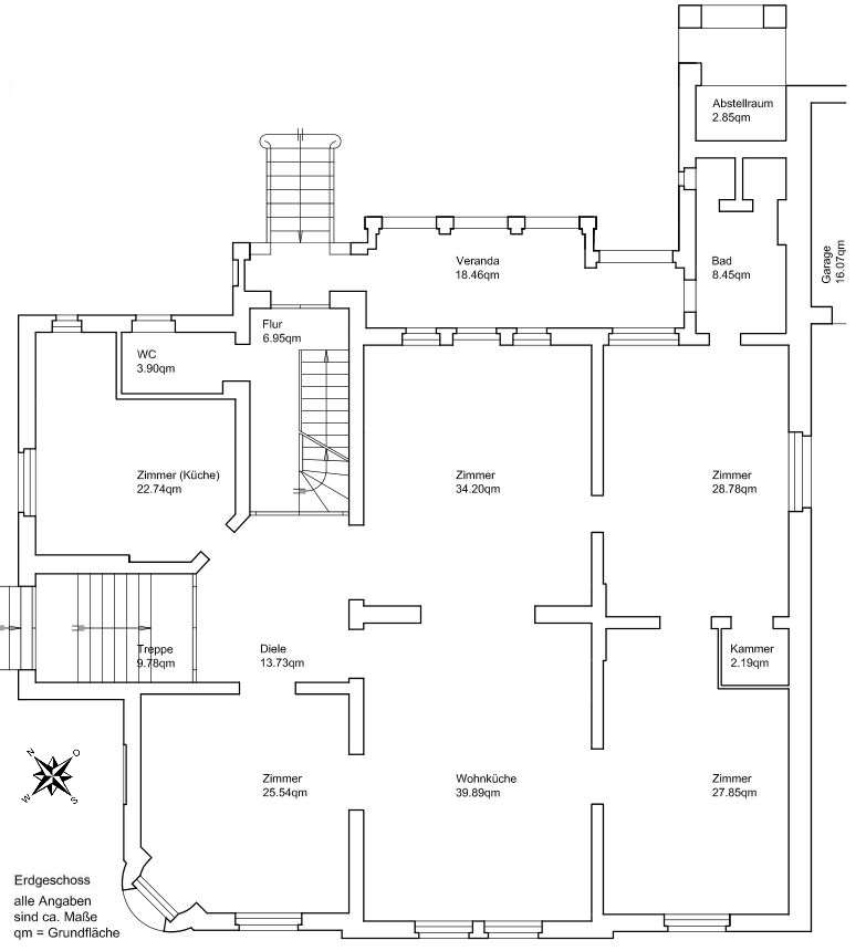 The listed villa is preserved in largely original state. Since German reunification it has been thoroughly renovated and modernized and is today in a very good condition. The inhabitable area of 450 m² can very easily be divided into two separate units, and without too much effort even into three or four units. The plot has a size of about 1,900 m². The garden with several tall trees resembles a park. The place lies in a calm residential area close to the centre of Luckenwalde. A comprehensive offering of schools as well as recreational and shopping facilities can be found within walking distance. After a bike ride of hardly more than five minutes one will be in the beautiful natural landscape of the Elsthal.