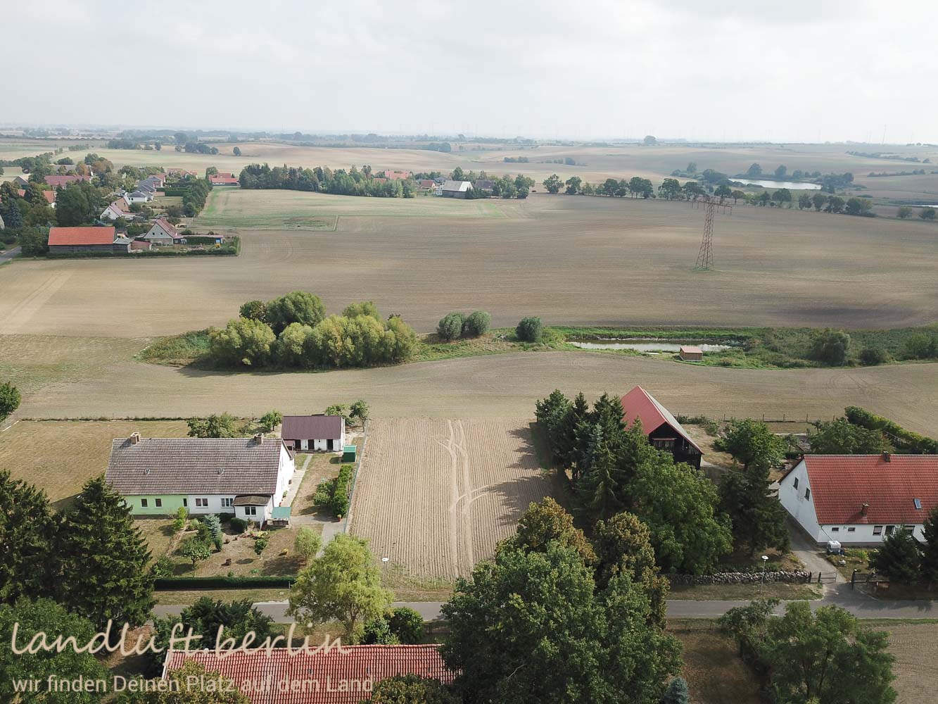 The partly developed building plot (electricity, water, telecom) measures 1,509 m² and can be reached on a sealed road. Currently the plot is used as farmland. It lies on the edges of a small village in the Uckermark, surrounded by a wide and open, hilly landscape, sprinkled with numerous ponds and small lakes and wind engines. However, none of the latter is visible from the plot. From there on looks eastwards across open farmland with a pond to the right. On the adjacent lots to the left and to the right, there are older one family dwellings. The city of Prenzlau lies a little more than 7 km away. From Berlin it will take about an 1:10 h to get there by car on the A11. The Train to Prenzlau will travel 1:20 h from Berlin Gesundbrunnen.