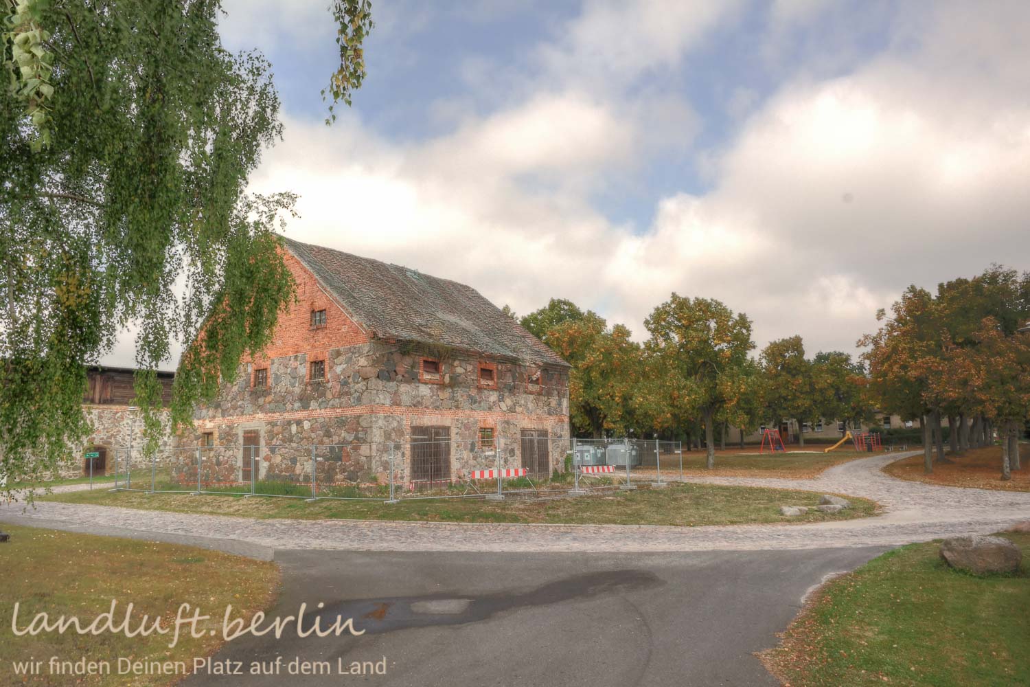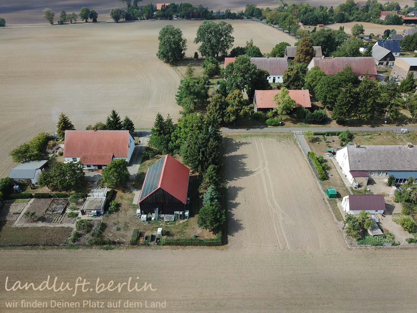 Das 1.509 m² große, nach Osten ausgerichtete Baugrundstück liegt am Rande eines kleinen uckermärkischen Gutsdorfes in einer weiten, geschwungenen und offenen Landschaft mit vielen Tümpeln, Teichen und Seen und manchem Windrad. Letztere sind vom Grundstück aus aber nicht zu sehen. Das Grundstück ist straßenseitig mit Strom-, Wasser-, und Telefonleitungen erschlossen. Die kleine Sackgasse, welche dorthin führt, ist asphaltiert. Aktuell wird das Grundstück als Ackerland genutzt. Nach Osten blickt man über die Landschaft zu einem kleinen Teich. Recht und links befinden sich mit älteren Einfamilienhäusern bebaute Grundstücke. In die Kreisstadt Prenzlau sind es nur gut 7 km. Von Berlin aus erreicht man den Ort in gut einer Stunde über die A11. Die Bahn von Berlin nach Prenzlau benötigt 1:20 h.