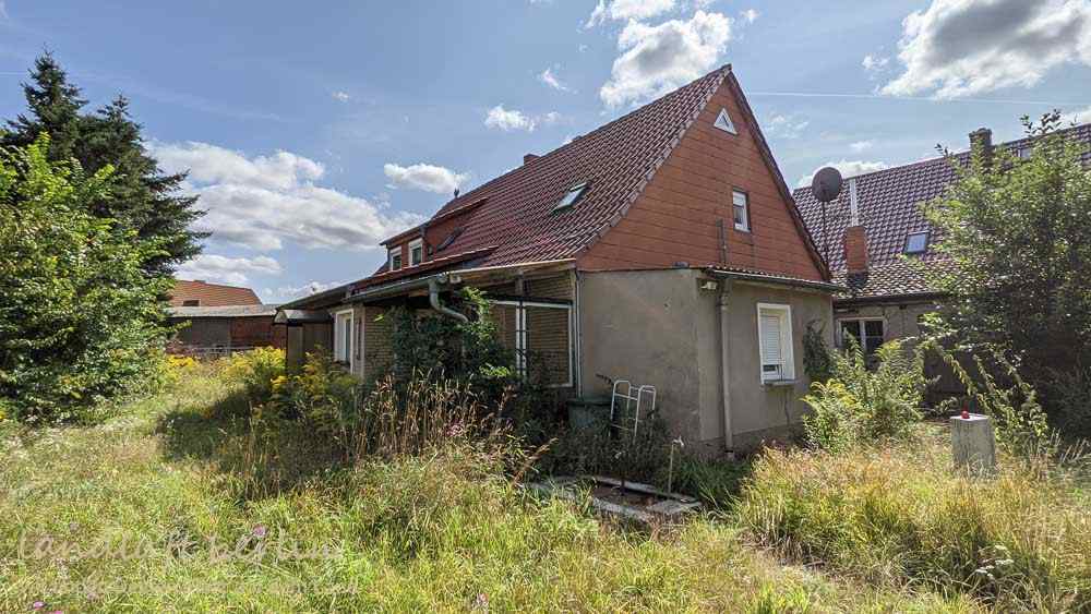 On the west-facing plot, there is in addition to the yard area and a large overgrown meadow, an also overgrown orchard. The property appears to be well suited also for keeping larger animals, too.