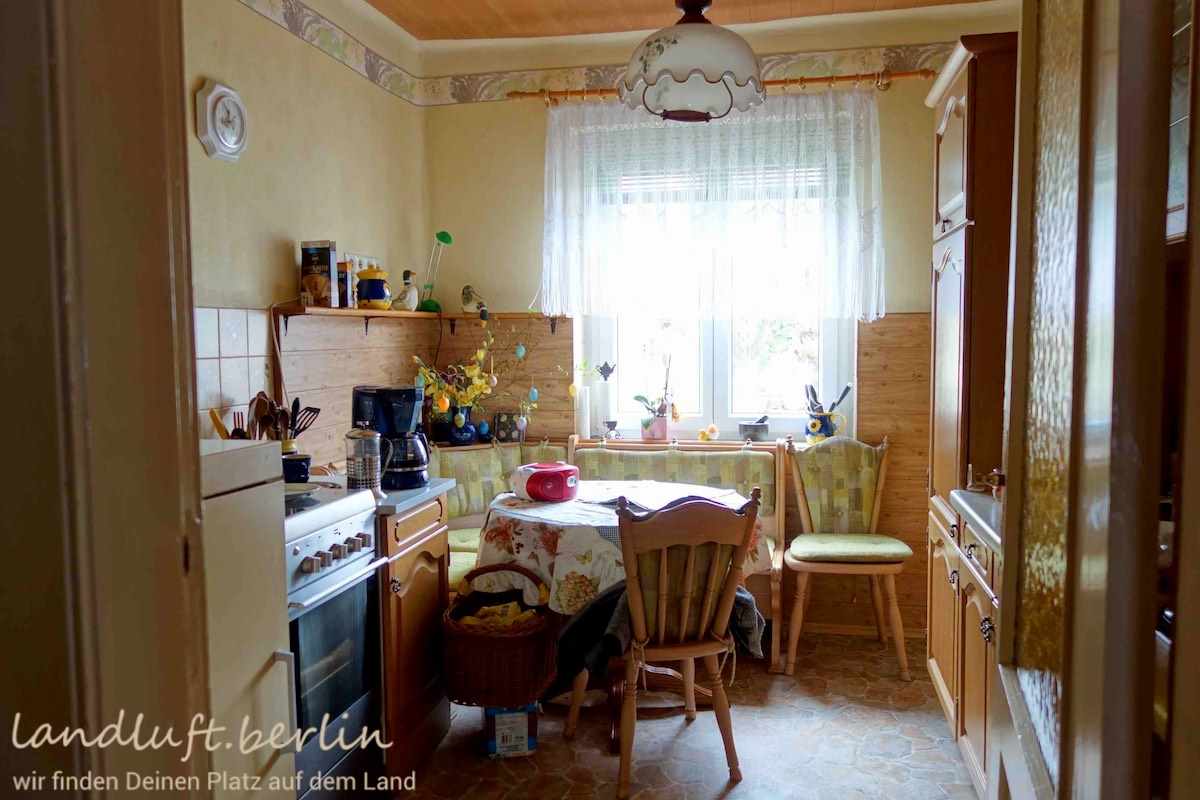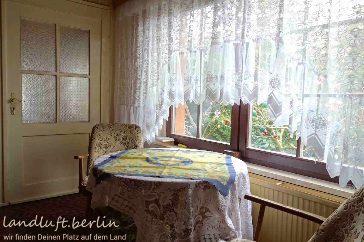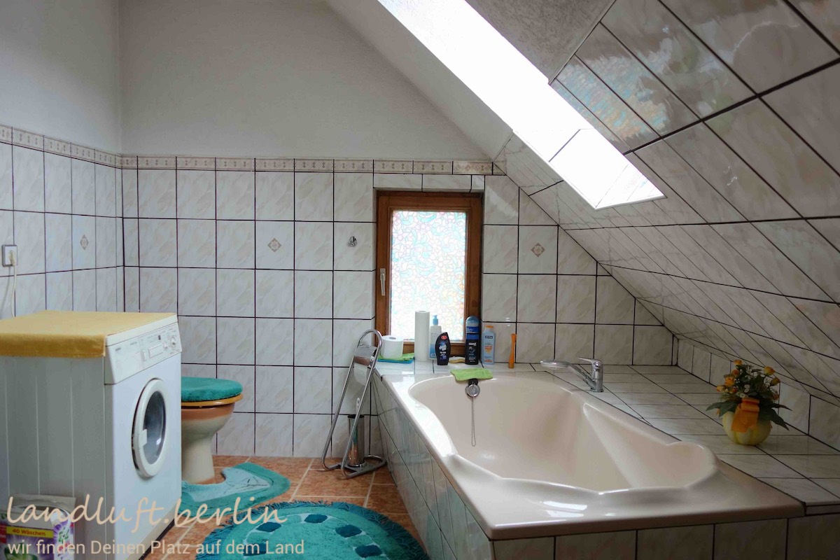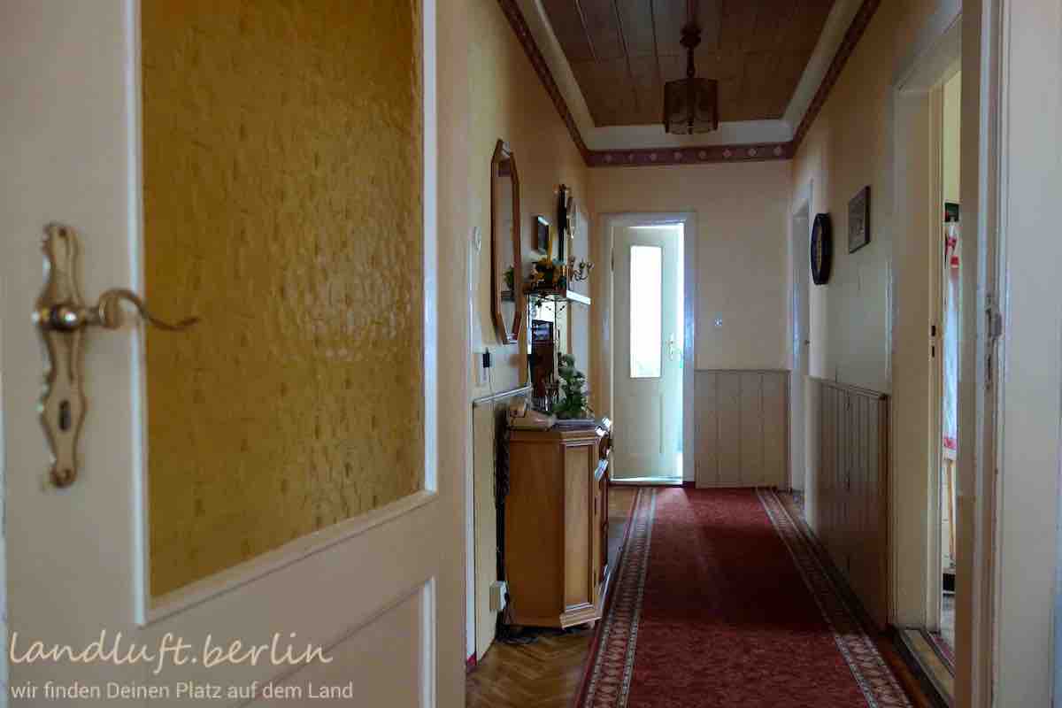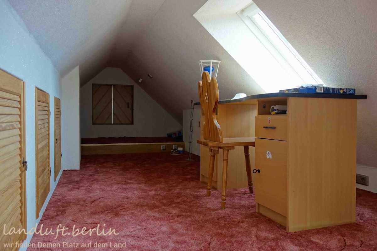 The one storey detached dwelling with a converted attic and an additional room right under the ridge is in a sound condition and has a total living space of about 159 m². It stands on a plot of about 2560 m² on the edges of a small settlement between the meandering idyllic river Havel and an impressive area covered with now water filled former brick pits – a kind of brick pit lake district. Behind the house there is a sheltered yard separated by two outbuildings from the large garden with two greenhouses. Right behind the plot a large woodland begins. In which, only about 150 m from the dwelling, there is a sandy swimming spot on an exceptionally clear lake. The place will be move-in ready in the autumn of 2019.